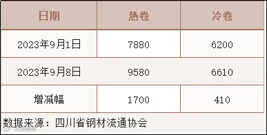 本周四川省钢材流通协会对样本钢厂关于板材出货量统计数据显示,热卷出货量9580吨,较上周增加1700吨。冷卷出货6610吨,较上周增加410吨。