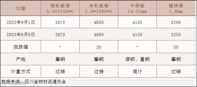据四川省钢材流通协会对本周成都现货市场监测显示:热轧板卷与上周价格相同;冷轧板卷较上周价格上涨30元/吨;中厚板与上周价格相同;镀锌卷较上周价格上涨50元/吨。