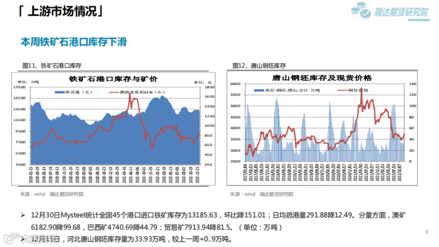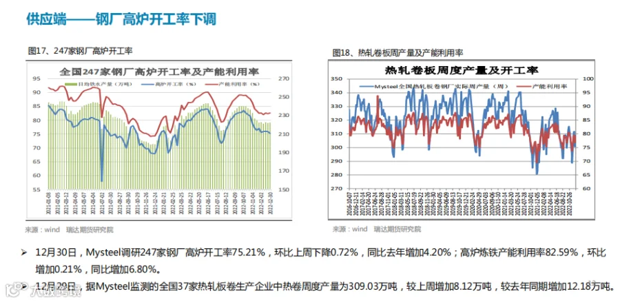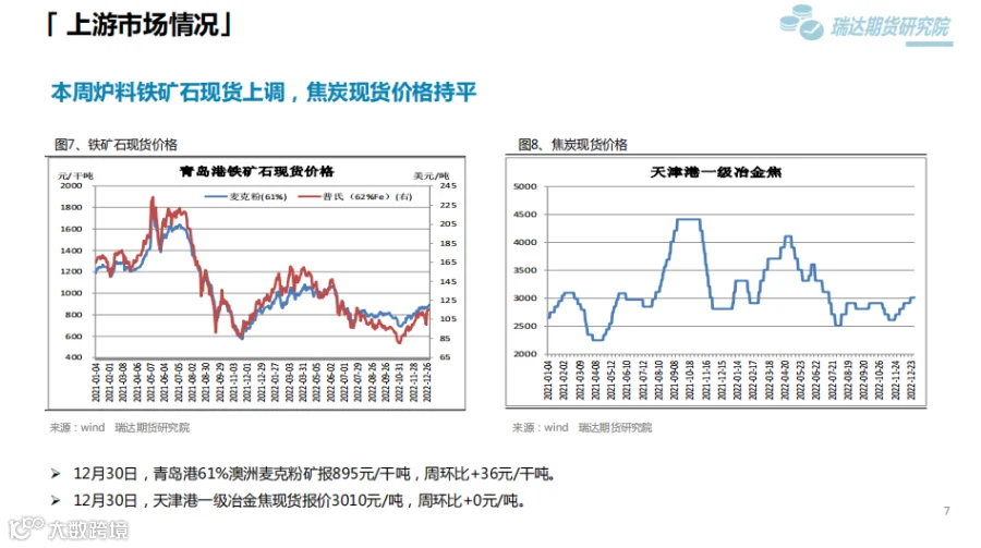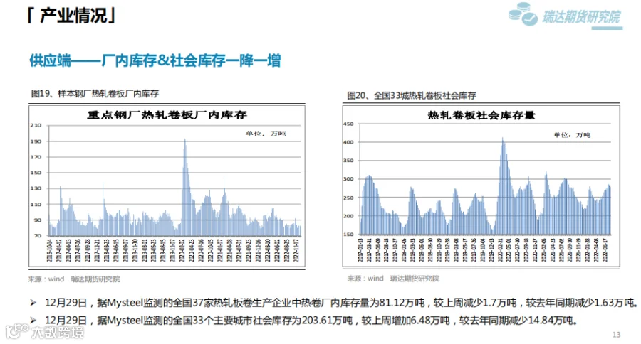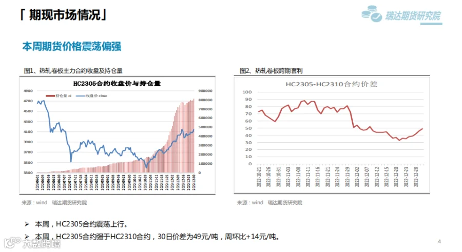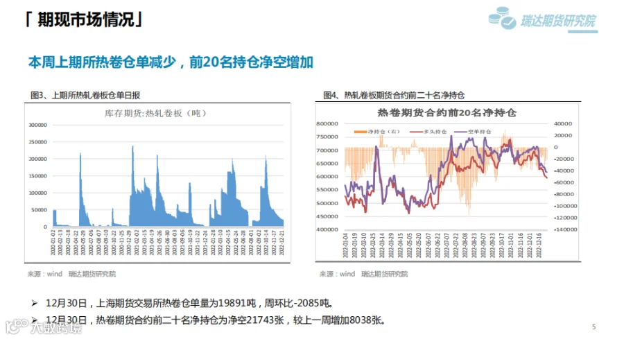 本周(12.23—12.30)热卷价格震荡走高。目前传统需求淡季特征依旧明显,终端需求边际改善乏力,市场商贸多持观望态度。但随着实际需求的转淡,市场重心已转移至冬储之上,乐观预期对价格构成有力支撑。