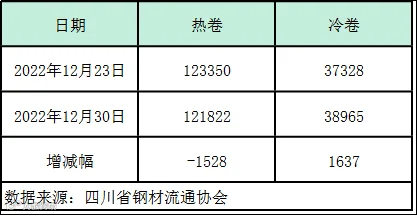 据四川省钢材流通协会统计,本周成都地区样本库房中热卷库存量为121822吨,较上周减少1528吨。冷卷库存量为38965吨,较上周增加1637吨。