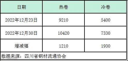本周四川省钢材流通协会对样本钢厂关于板材出货量统计数据显示,热卷出货量10420吨,较上周减少增加1210吨。冷卷出货量7330吨,较上周增加1930吨。