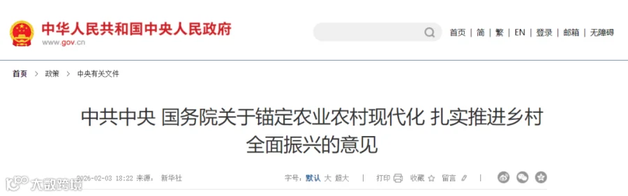 农业农村现代化关系中国式现代化全局和成色。“十四五”时期,农业综合生产能力迈上新台阶,脱贫攻坚成果巩固拓展,农民生活水平显著提高,乡村全面振兴取得明显进展。“十五五”时期是基本实现社会主义现代化夯实基础、全面发力的关键时期,要加快补上农业农村领域突出短板,加快建设农业强国。2026年是“十五五”开局之年,做好“三农”工作至关重要。要坚持以习近平新时代中国特色社会主义思想为指导,深入贯彻党的二十大和二十届历次全会精神,认真落实四中全会部署,全面贯彻习近平总书记关于“三农”工作的重要论述和重要指示精神,坚持把解决好“三农”问题作为全党工作重中之重,坚持和加强党对“三农”工作的全面领导,完整准确全面贯彻新发展理念,坚持稳中求进工作总基调,坚持农业农村优先发展,坚持城乡融合发展,锚定农业农村现代化,以推进乡村全面振兴为总抓手,以学习运用“千万工程”经验为引领,以改革创新为根本动力,提高强农惠农富农政策效能,守牢国家粮食安全底线,持续巩固拓展脱贫攻坚成果,提升乡村产业发展水平、乡村建设水平、乡村治理水平,努力把农业建成现代化大产业、使农村基本具备现代生活条件、让农民生活更加富裕美好,为推进中国式现代化提供基础支撑。