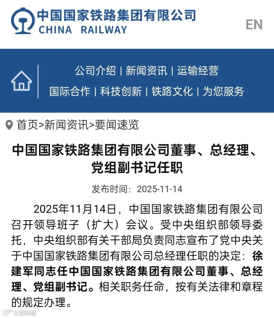 2025年11月14日,中国国家铁路集团有限公司召开领导班子(扩大)会议。受中央组织部领导委托,中央组织部有关干部局负责同志宣布了党中央关于中国国家铁路集团有限公司总经理任职的决定:徐建军同志任中国国家铁路集团有限公司董事、总经理、党组副书记。相关职务任命,按有关法律和章程的规定办理。