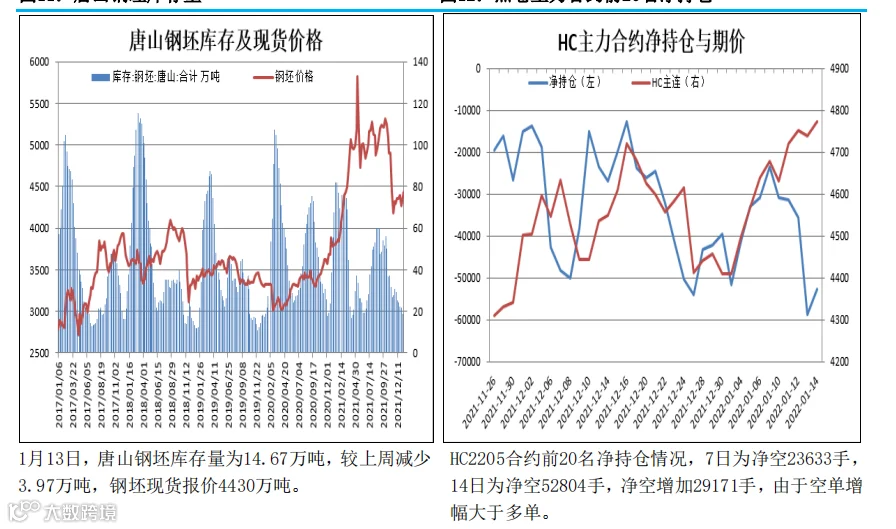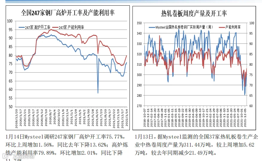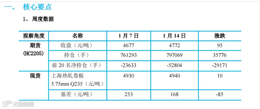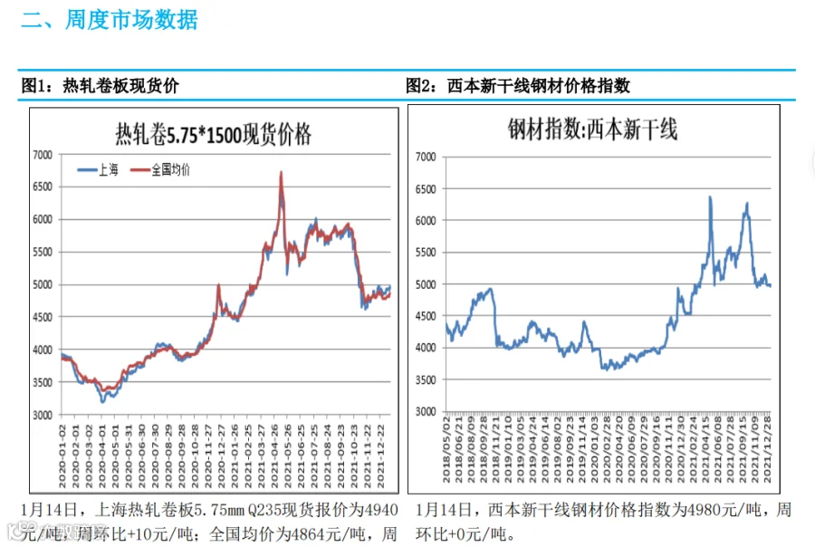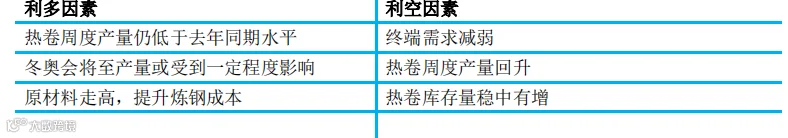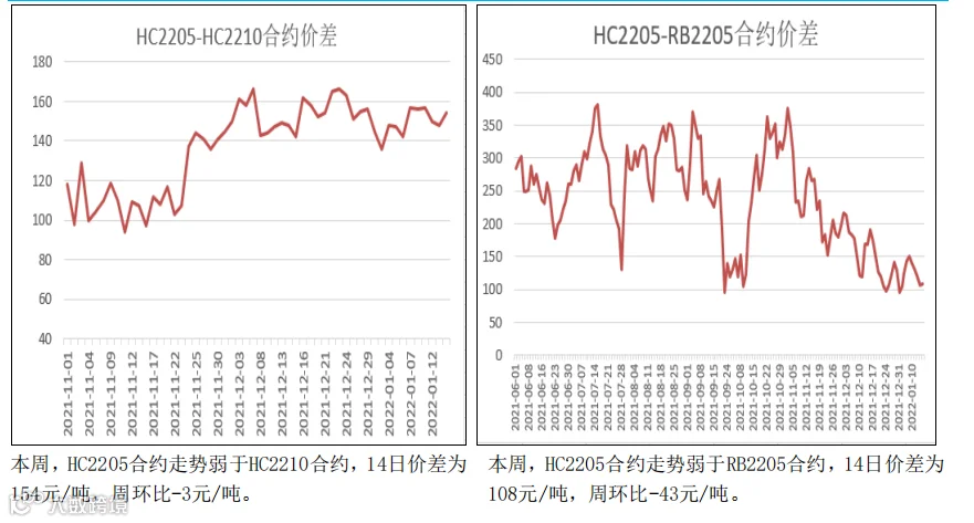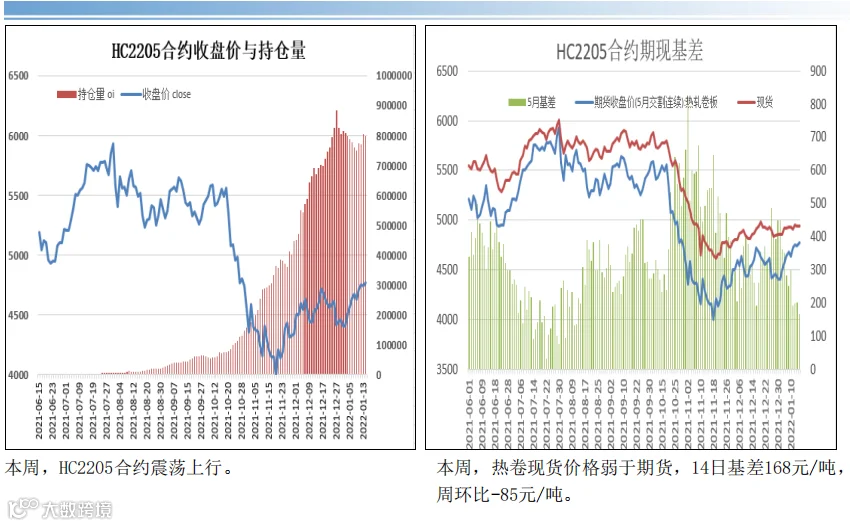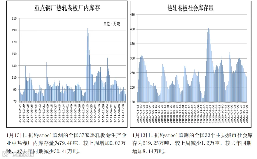 周度观点策略总结:本周(1.7-1.14)热轧卷板期货震荡走高。原材料期现货价格偏强运行,炼钢成本提升继续对热卷期现货价格带来支撑。但本期热卷周度产量继续回升,而库存总量变化不大,目前终端需求保持低迷,日前相对乐观的冬储情绪有所收敛。考虑到近期价格涨幅较大,在缺乏需求支撑情况下,期价上行空间或受到抑制,可考虑区间操作。