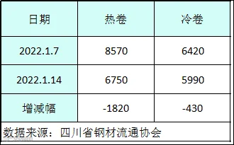 本周四川省钢材流通协会对样本钢厂关于板材出货量统计数据显示,热卷出货量6750吨,较上周减少1820吨。冷卷出货量5990吨,较上周减少430吨。