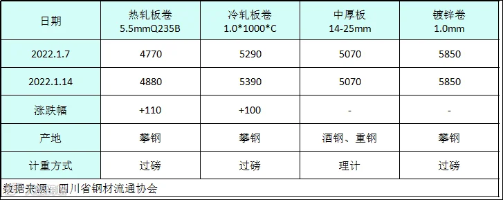 据四川省钢材流通协会对本周成都现货市场监测显示;热轧板卷较上周价格上涨110元/吨;冷轧板卷较上周价格上涨100元/吨;中厚板镀锌卷价格较上周价格持平。