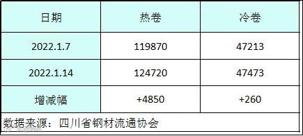 据四川省钢材流通协会统计,本周成都地区样本库房中热卷库存量为124720吨,较上周增加4850吨。冷卷库存量为47473吨,较上周增加260吨。