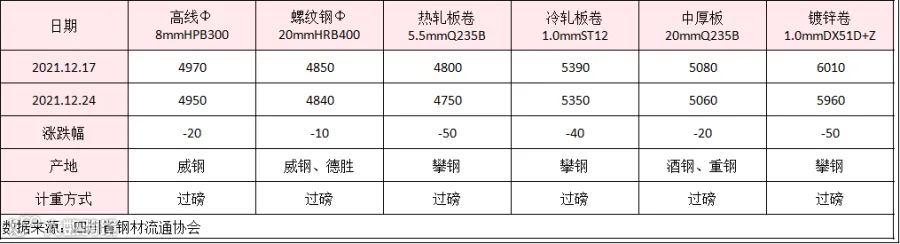 本期(12.17-12.24)建筑钢材价格区间整理,临近年底,终端需求表现一般,但产量维持低位,市场观望情绪较浓。下周(12.24-12.31)建筑钢材价格仍有反复,当前川内部分钢厂高炉仍处在检修状态,产量维持低位且明显低于去年同期水平;虽然需求表现一般,但省外资源到货减少,叠加部分钢厂不饱和生产,库存量继续下滑;最后,当前国内外疫情相对严峻,对市场情绪及大宗商品价格产生冲击。