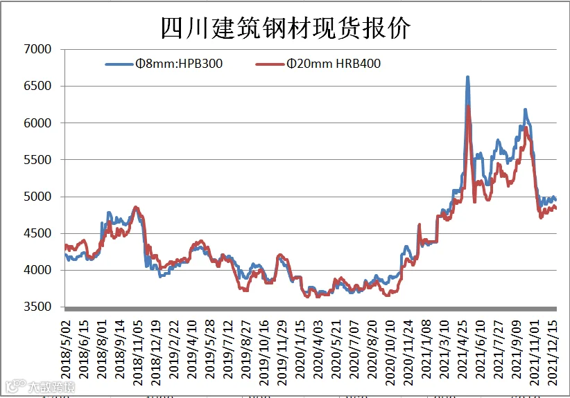 据四川省钢材流通协会对成都现货市场监测显示,本期(12.17-12.24)建筑钢材价格区间整理,临近年底,终端需求表现一般,但产量维持低位,市场观望情绪较浓。12月24日,成都地区Φ20mm HRB400螺纹钢价格为4840元/吨,较12月17日跌10元/吨;Φ8mm HPB300高线价格为4950元/吨,跌20元/吨。