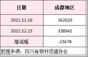 据四川省钢材流通协会统计,截止12月23日成都地区样本库房中螺纹钢及线材库存总量为338942吨,较上周减少23678吨,较去年同期增加7774吨。本期库存量延续下降,因省外资源到货减少,且川内部分钢厂检修供应维持低位。