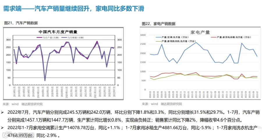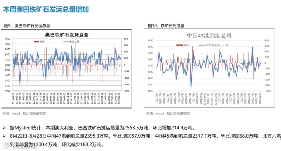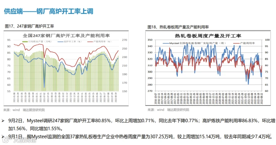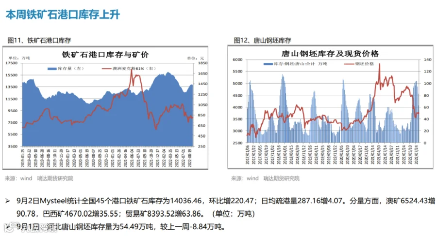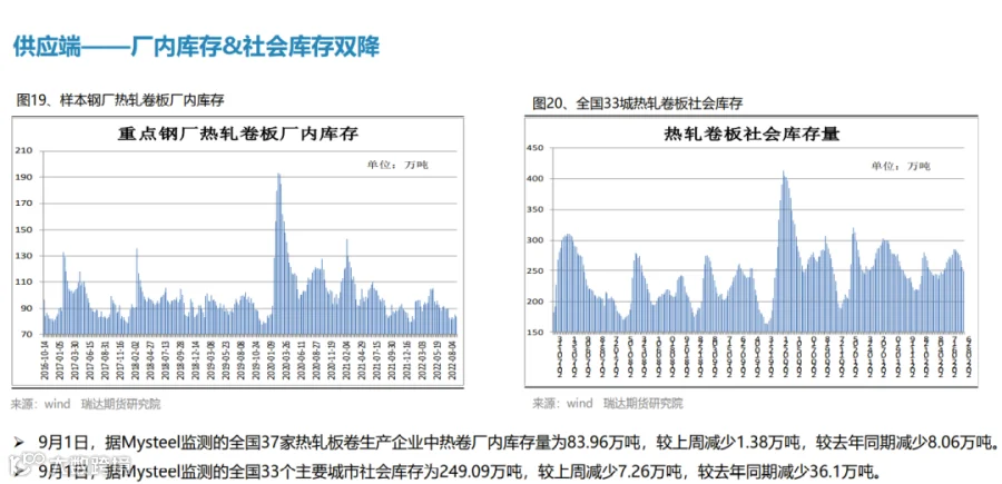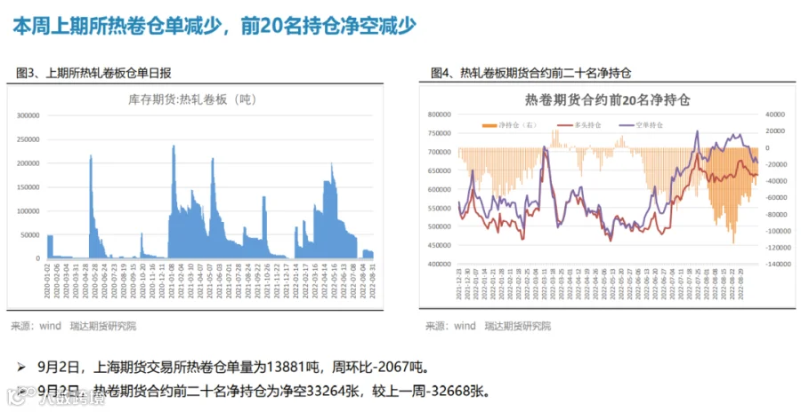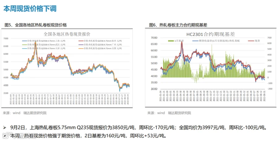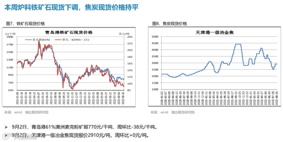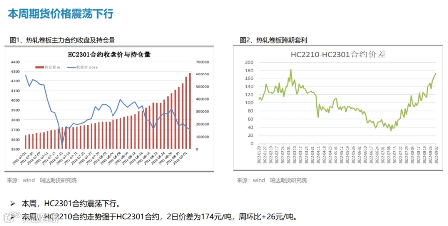 本周(8.26-9.2)热轧卷板价格震荡下行。由于美联储主席鲍威尔发出最强“鹰”,美联储激进加息预期打压市场情绪,叠加本周热卷产量增幅扩大,而终端需求表现一般,期货盘面走弱拖累现货下行。下周(9.2-9.9))热卷价格或陷入区间整理。供应端,在限电和限产影响程度逐步减弱后,钢厂复产积极性明显提升,热卷周度产量或继续回升。需求端,受现货价格震荡偏弱影响,市场采购积极性不高,热卷库存整体变化不大。最后,美联储激进加息预期仍利空大宗商品,而国常会再吹稳经济暖风也将一定程度上提振市场信心。