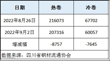 据四川省钢材流通协会统计,本周成都地区样本库房中热卷库存量为207316吨,较上周减少8757吨。冷卷库存量为60057吨,较上周减少7645吨。