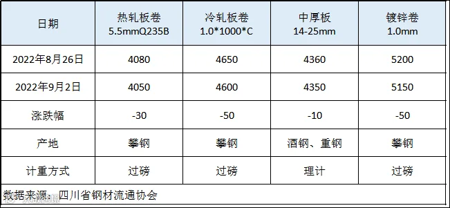 表一:本周四川市场部分板材价格变化汇总(单位:元/吨)