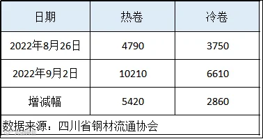 本周四川省钢材流通协会对样本钢厂关于板材出货量统计数据显示,热卷出货量10210吨,较上周增加5420吨。冷卷出货量6610吨,较上周增加2860吨。
