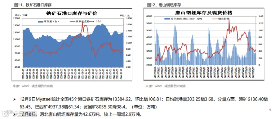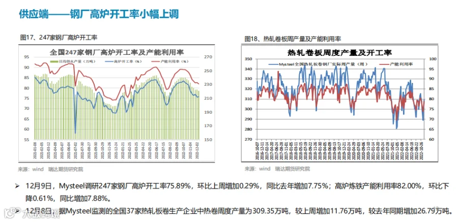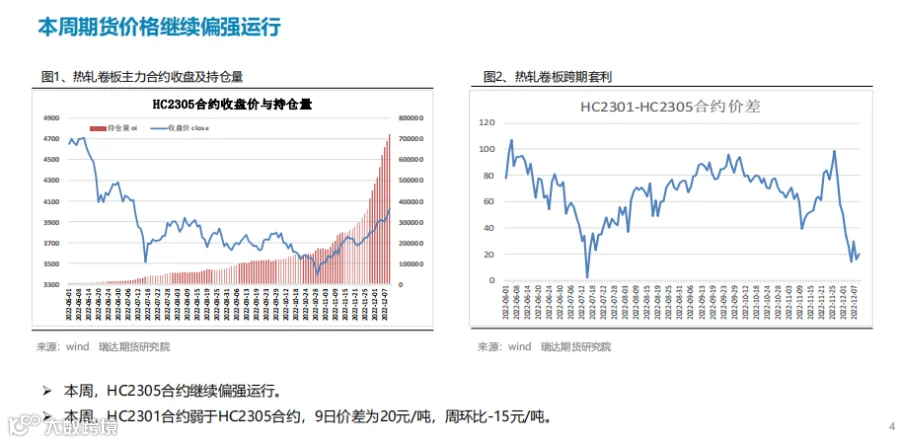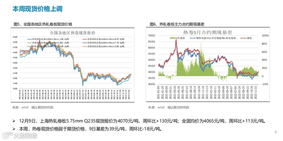 本周(12.2-12.9)热卷价格继续走高。周初期价陷入区间整理,但随着中共中央政治局会议的召开,会议分析研究2023年经济工作,同时指出,明年要坚持稳字当头、稳中求进对市场情绪有所提振,另外本周热卷表现消费量再度回升支撑期现货价格向上走高。