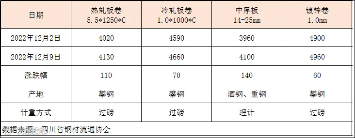 据四川省钢材流通协会对本周成都现货市场监测显示:热轧板卷较上周价格上涨110元/吨;冷轧板卷较上周价格上涨70元/吨;中厚板价格较上周价格上涨140元/吨;镀锌卷价格较上周价格上涨60元/吨。