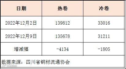 据四川省钢材流通协会统计,本周成都地区样本库房中热卷库存量为135678吨,较上周减少4134吨。冷卷库存量为31211吨,较上周减少1805吨。