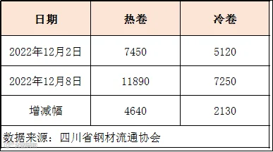 本周四川省钢材流通协会对样本钢厂关于板材出货量统计数据显示,热卷出货量11890吨,较上周增加4640吨。冷卷出货量7250吨,较上周增加2130吨。