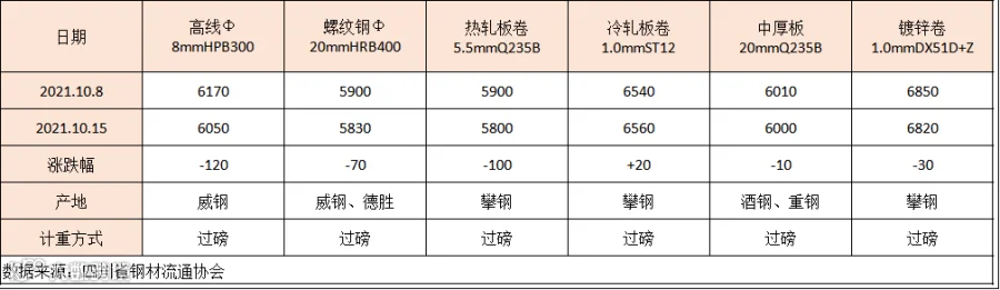 据四川省钢材流通协会对成都现货市场监测显示,本期(10.8-10.15)建筑钢材价格承压回落,节后产量存回升预期,同时高层表示将增加大宗商品、关键零部件生产供应,提升重要商品供给能力,市场情绪受挫。10月15日,成都地区Φ20mm HRB400螺纹钢价格为5830元/吨,较10月8日跌70元/吨;Φ8mm HPB300高线价格为6050元/吨,跌120元/吨。