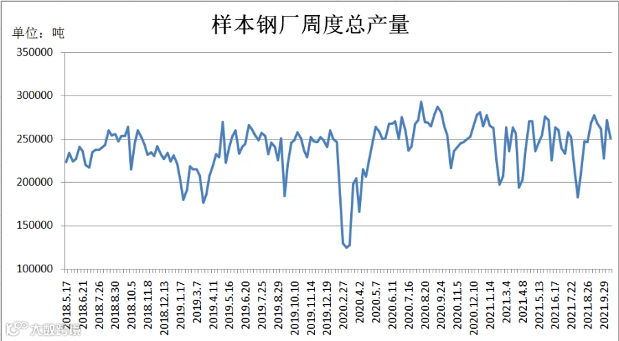 (10月8日-10月14日)四川省钢材流通协会对四家样本钢厂关于建材产量统计数据显示,本周B、C、D产量较上周分别减少9326.50吨、5000吨、12275吨;A较上周增加5000吨。四家样本钢厂总产量为250348吨,周环比减少21602吨。