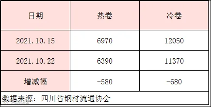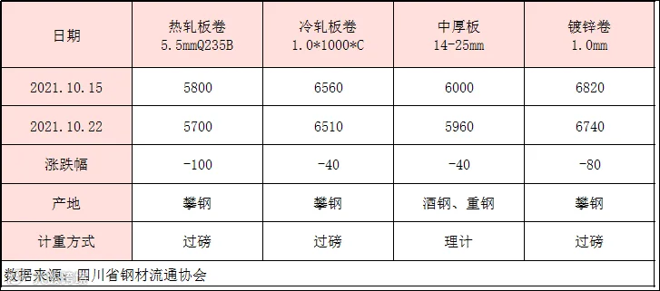 据四川省钢材流通协会对本周成都现货市场监测显示;热轧板卷较上周下跌100元/吨;冷轧板卷较上周价格下跌40元/吨;中厚板价格较上周下跌40元/吨;镀锌板价格较上周下跌80元/吨。
