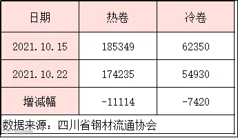 据四川省钢材流通协会统计,本周成都地区样本库房中热卷库存量为174235吨,较上周减少11114吨。冷卷库存量为54930吨,较上周减少7420吨。