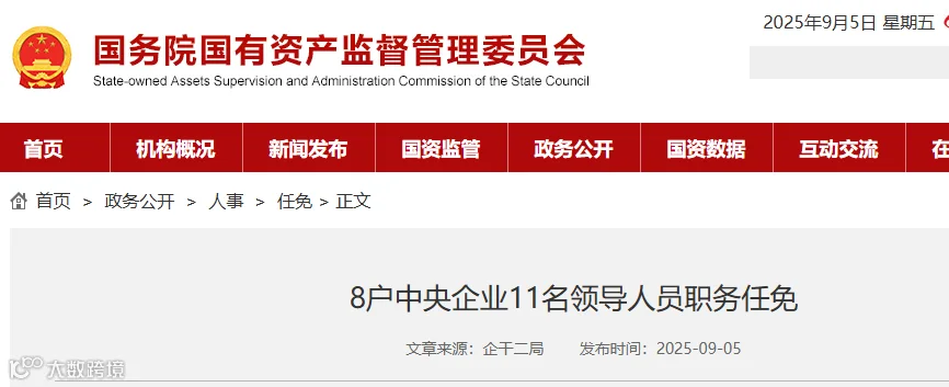 9月5日,国务院国资委网站发布8户中央企业11名领导人员职务任免信息。