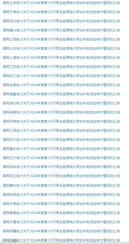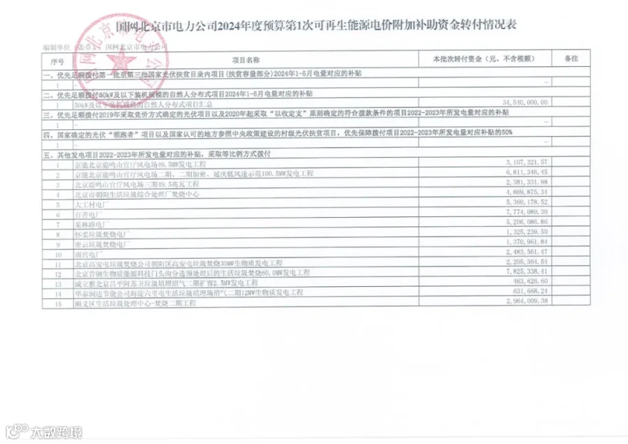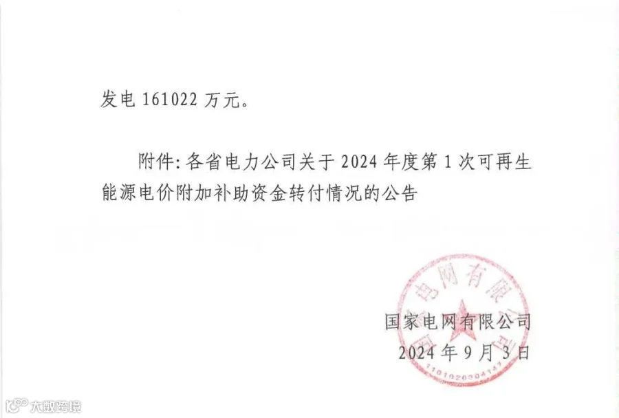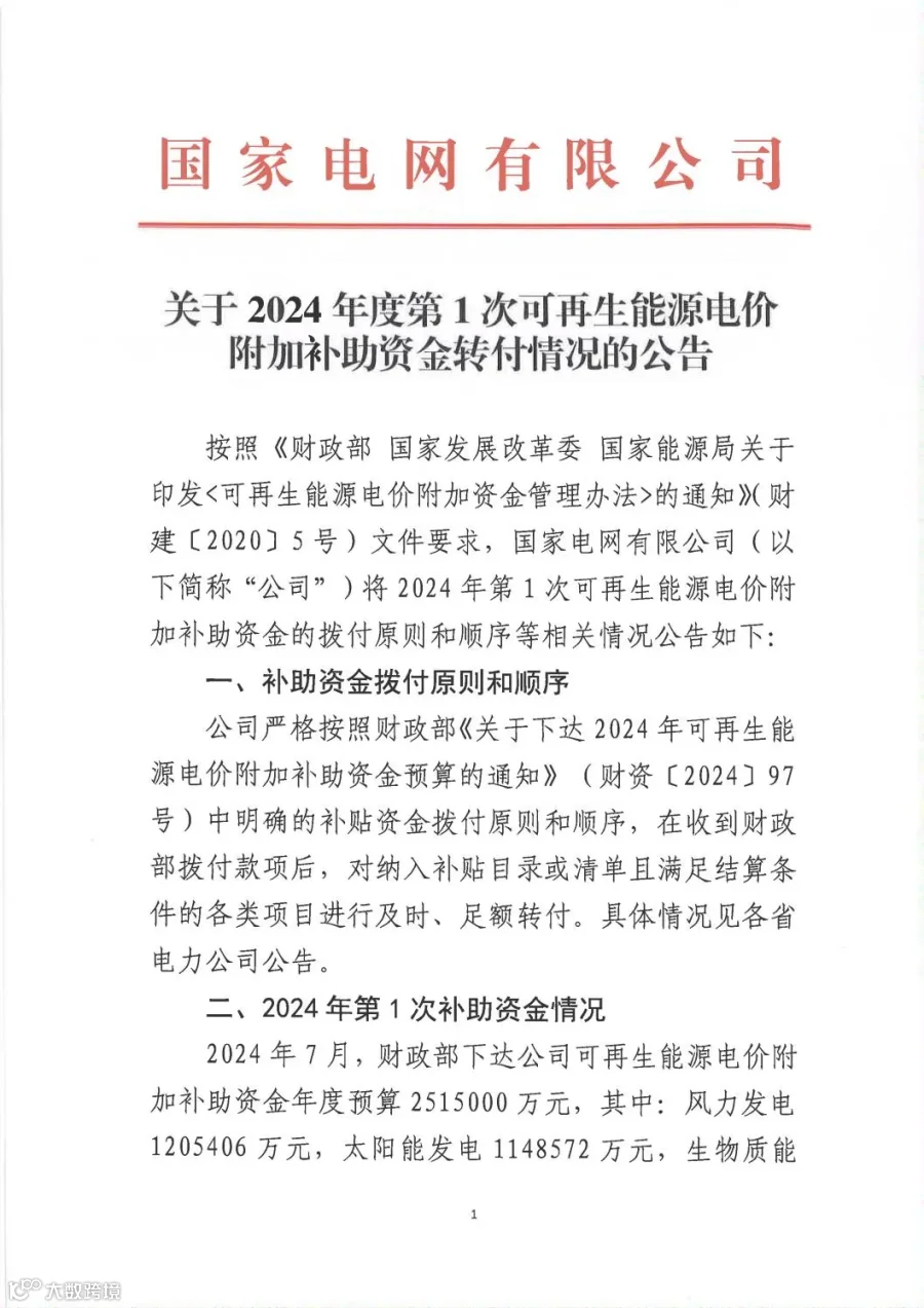 日前,国家电网有限公司发布关于2024年度第1次可再生能源电价附加补助资金转付情况的公告,公告显示:2024年7月,财政部下达公司可再生能源电价附加补助资金年度预算251.5亿元,其中: