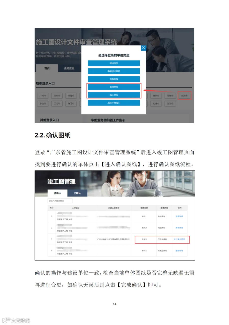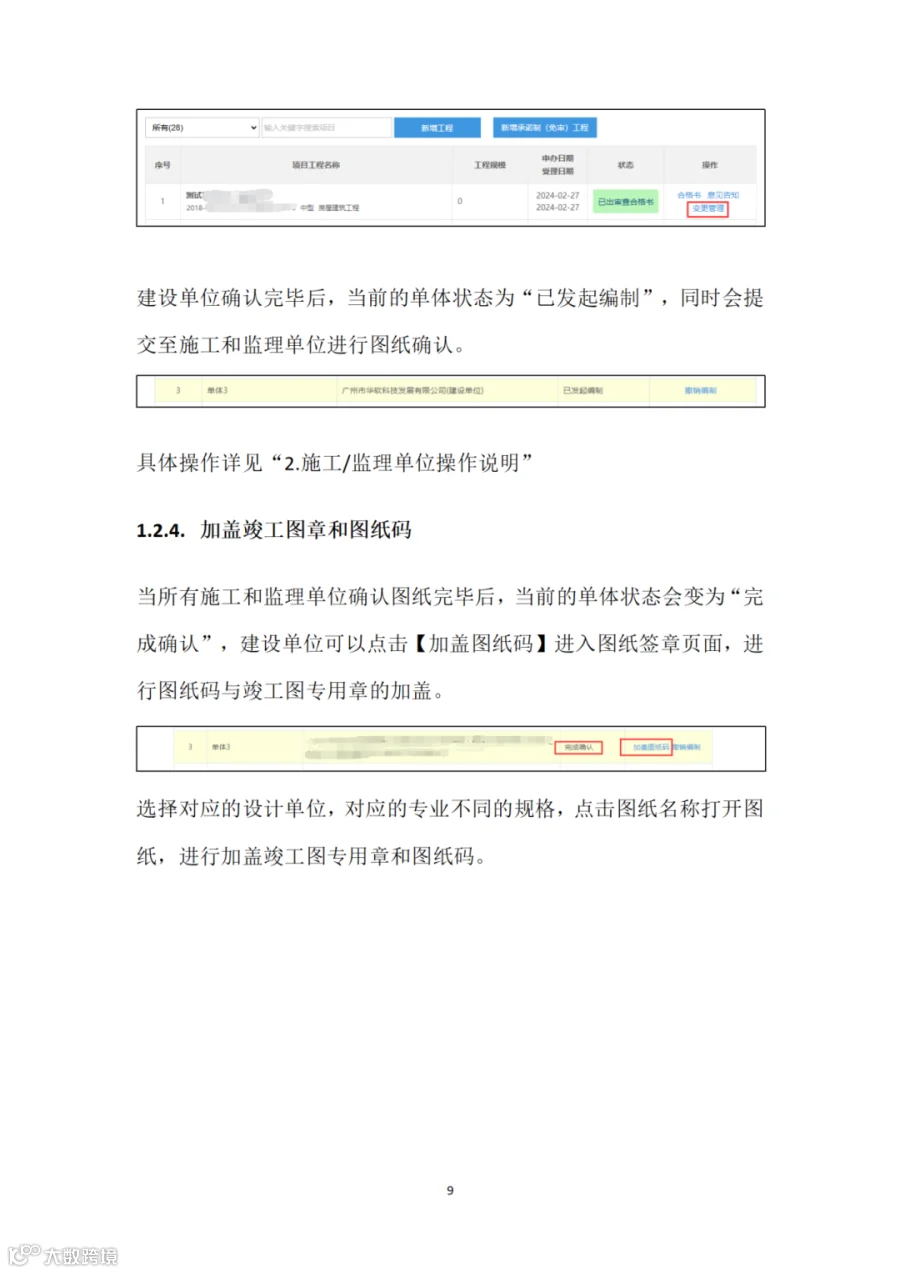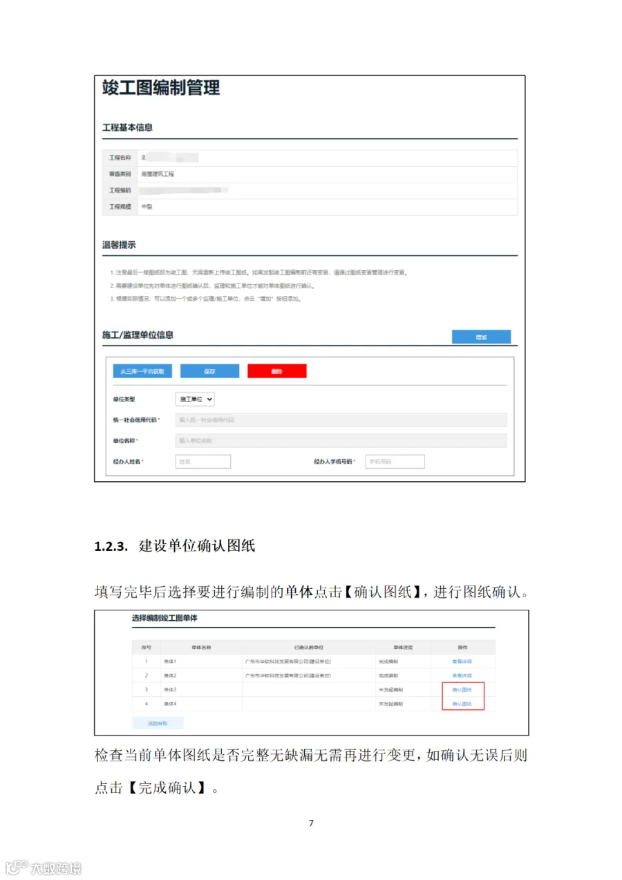 (三)竣工验收阶段。建设单位组织施工、监理单位在“广东省施工图设计文件审查管理系统”的“竣工图管理”栏目确认施工图设计单位、工程变更等信息,确认核实后,各单位线上加盖竣工专用章,完成竣工图编制,无需另行编制纸质竣工图纸(详见附件2)。