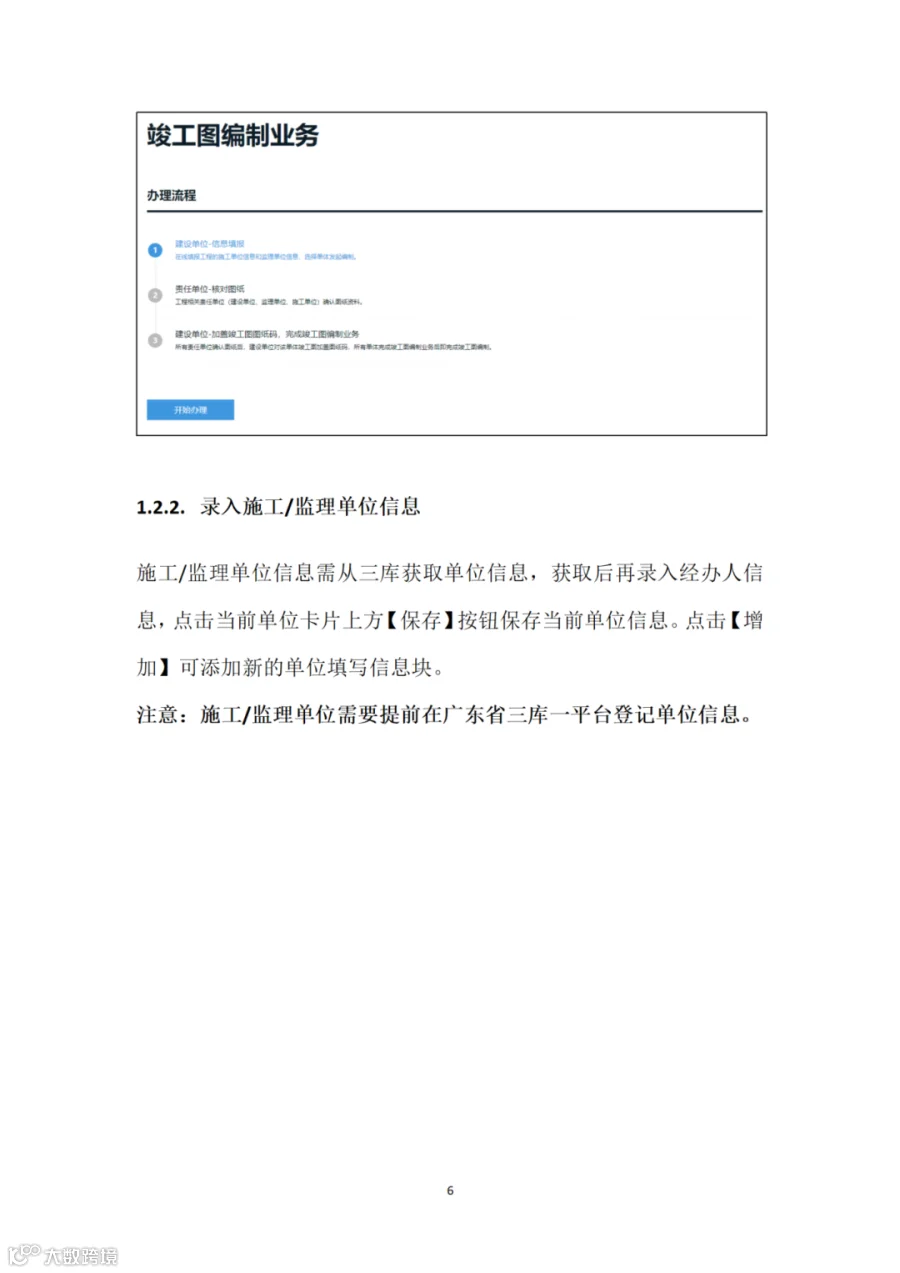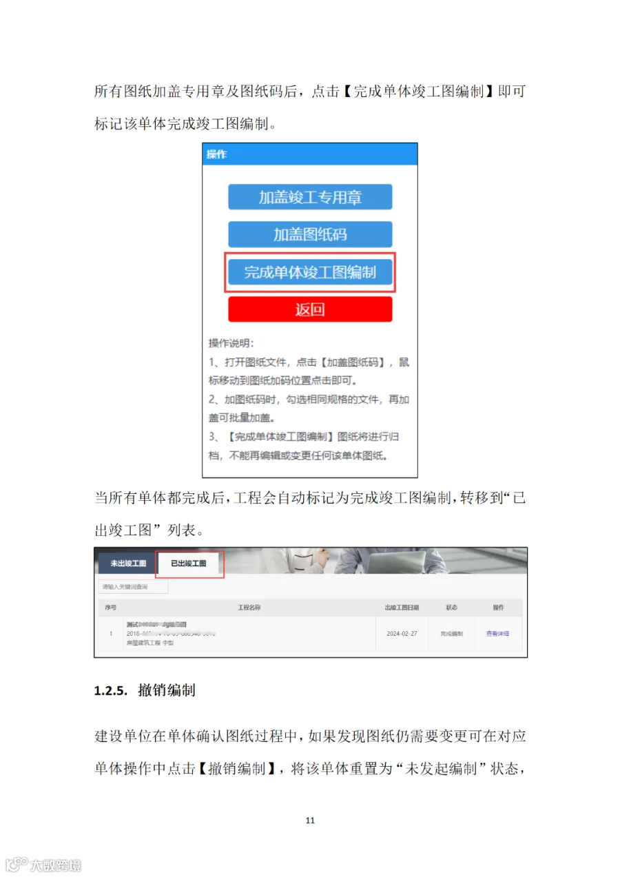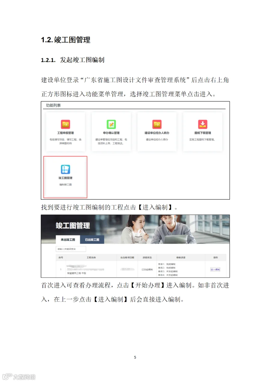 (三)竣工验收阶段。建设单位组织施工、监理单位在“广东省施工图设计文件审查管理系统”的“竣工图管理”栏目确认施工图设计单位、工程变更等信息,确认核实后,各单位线上加盖竣工专用章,完成竣工图编制,无需另行编制纸质竣工图纸(详见附件2)。
