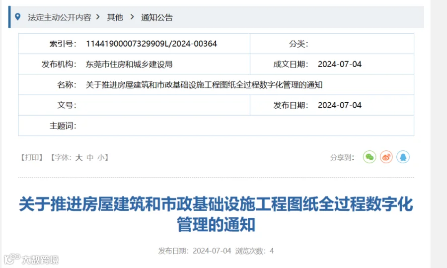 7月4日,东莞市住建局发布《关于推进房屋建筑和市政基础设施工程图纸全过程数字化管理的通知》。