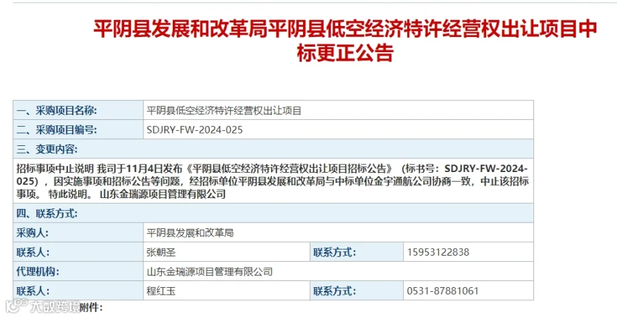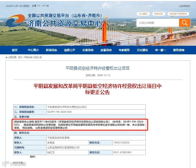 12月13日,济南公共资源交易中心官网发布平阴县发展和改革局公告,中止该县低空经济特许经营权项目招标事项。