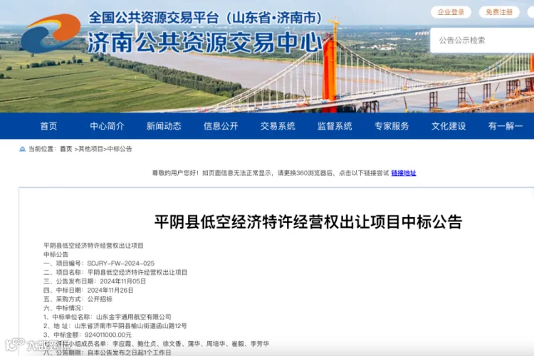 平阴县低空经济特许经营权出让项目中标公告,目前已从网站上撤下。图片来源/济南公共资源交易中心官网