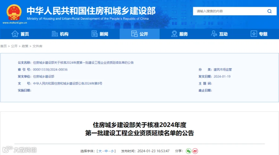日前,住建部公布了《关于核准2024年度第一批建设工程企业资质延续名单的公告》。