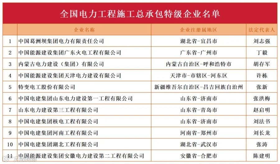 全国电力总承包特级企业名单