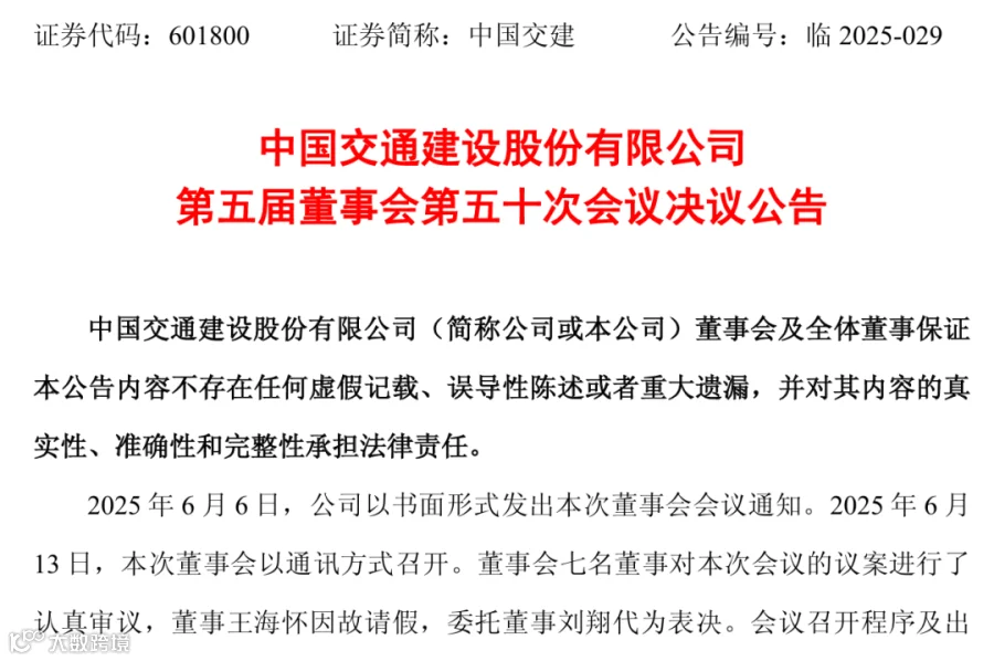 6月14日,中国交通建设股份有限公司发布第五届董事会第五十次会议决议公告。公告披露2025年6月13日的董事会以通讯方式召开,董事王海怀因故请假。