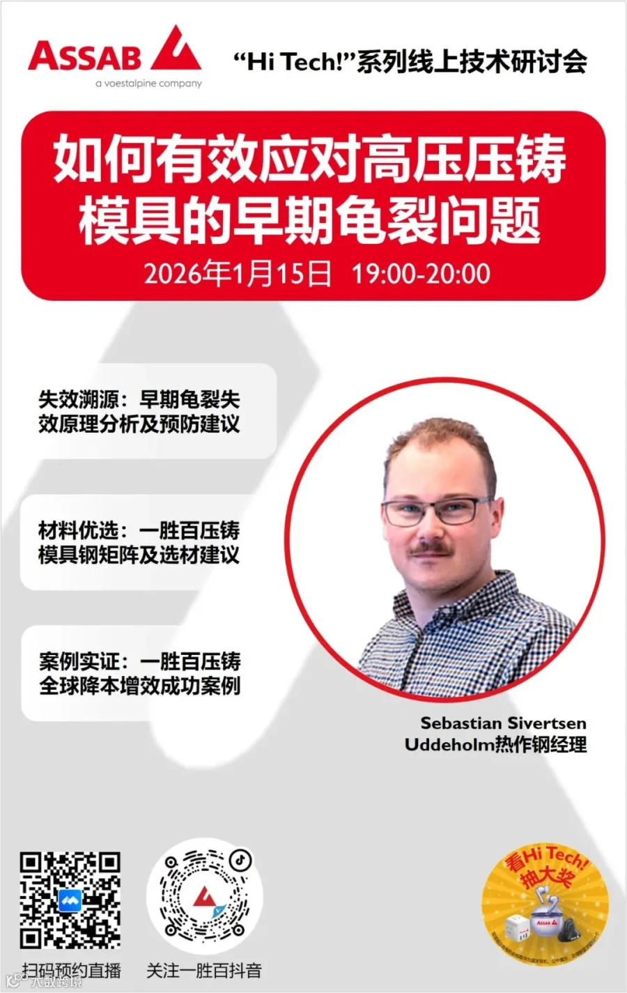 锁定1月15日一胜百"Hi Tech!"线上技术研讨会,瑞典Uddeholm钢厂热作钢经理Sebastian Sivertsen,结合其多年热作钢应用经验与全球压铸行业实战案例,邀您共同关注“如何有效应对高压压铸模具的早期龟裂问题”。