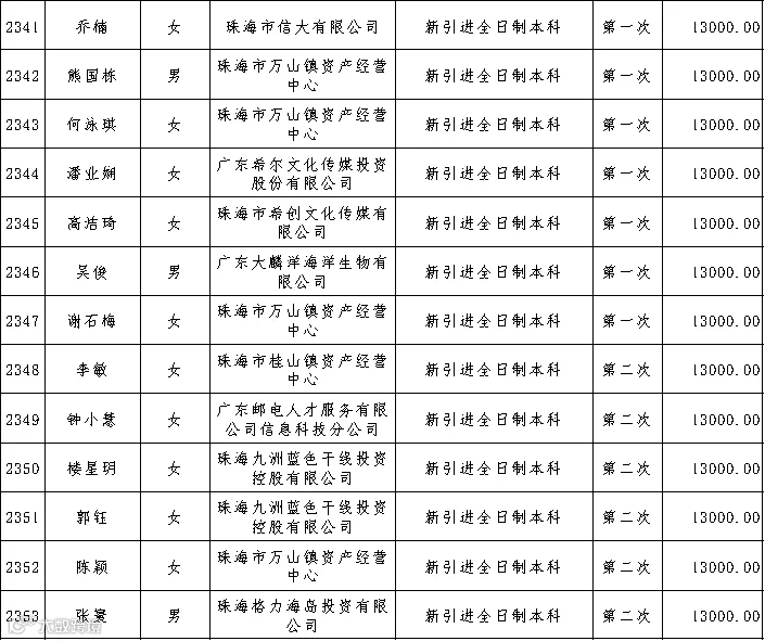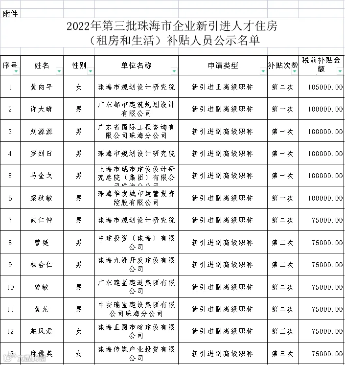 根据官网显示每年有三批公示,去年11月,人社局公示2022年第三批珠海市企业新引进人才住房(租房和生活)补贴人员名单,共2353人拿到补贴。