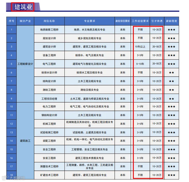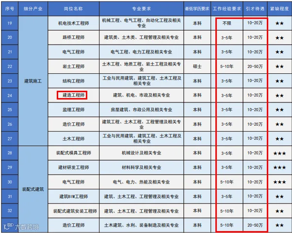 《目录》以表格形式对每个行业中的细分产业、岗位名称、专业要求、学历要求、工作经验、引才待遇和紧缺程度七个要素进行描述。其中,对于目前建筑行业紧缺的建造工程师、监理工程师、造价工程师等各类人才补贴如下: