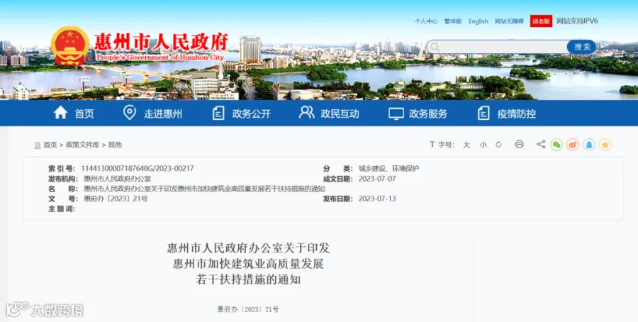 近日,惠州市人民政府发布《惠州市加快建筑业高质量发展若干扶持措施》,自2023年7月7日起执行,有效期3年。