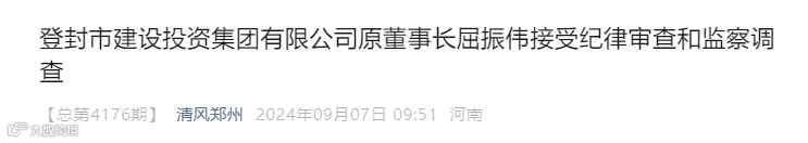 9月7日,登封市建设投资集团有限公司原董事长屈振伟被查;