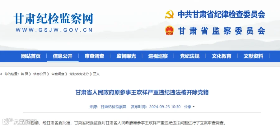 9月23日,甘肃省建设投资(控股)集团原董事长、甘肃省保障性安居工程建设投资有限公司原董事长王欢祥被立案调查、开除党籍;