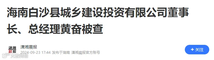 9月23日,白沙黎族自治县城乡建设投资有限公司董事长、总经理黄奋被查;