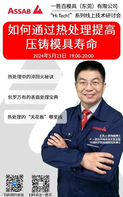 5月23日,一胜百华南业务开发总监黄海威博士将在“Hi Tech!” 直播间与您重点探讨“如何通过热处理提升压铸模具的寿命”,以及其他热处理/表面处理的知识小百科。