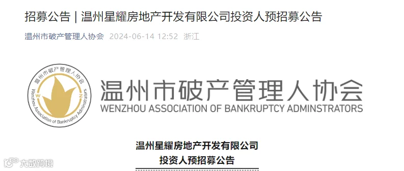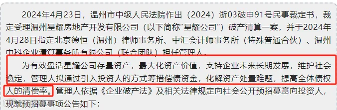 据了解,在2024年4月14日,温州市破产管理人协会发布了一则投资人预招募公告,拟通过引入投资人的方式筹措偿债资金,化解资产处置难题,提高全体债权人的清偿率。
