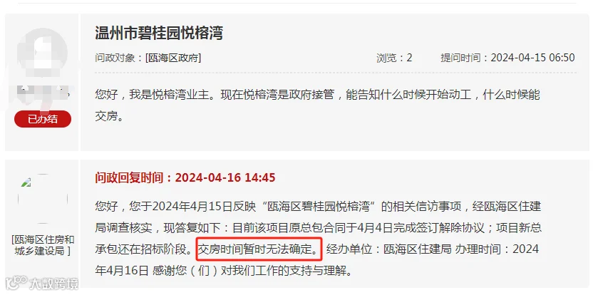 上个月,一名自称是房开公司工作人员介绍:公司已与原施工单位解除工程施工合同,并于日前重新组织招标程序,预计5月能恢复现场施工,但原定的2024年底交付可能存在难度。(信息源于温州都市报)