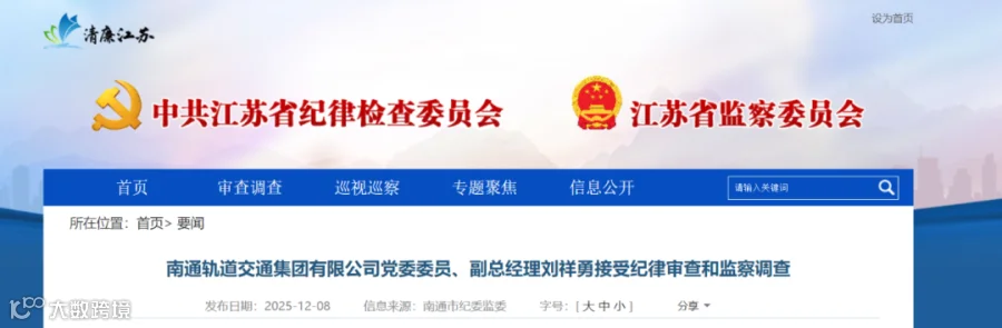 刚刚,江苏省纪委监委通报:南通轨道交通集团副总经理刘祥勇被查。