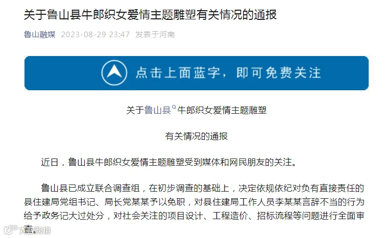 据鲁山融媒29晚近24时消息,鲁山县联合调查组发布关于鲁山县牛郎织女爱情主题雕塑有关情况的通报。