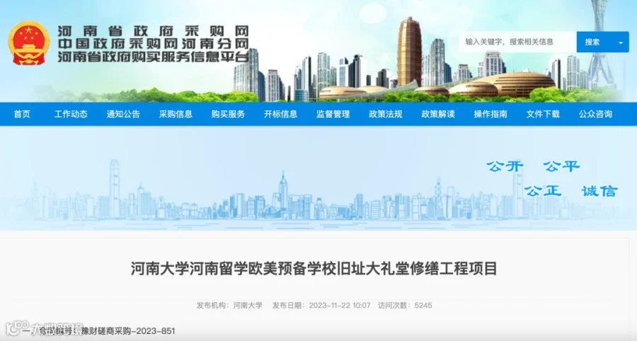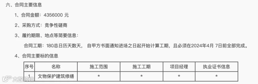去年11月22日,河南省政府采购网发布河南大学河南留学欧美预备学校旧址大礼堂修缮工程项目,供应商(乙方)为北京同兴古建筑工程有限责任公司。该项目合同金额为4356000元,合同工期180天,必须在2024年4月7日前全部完成。