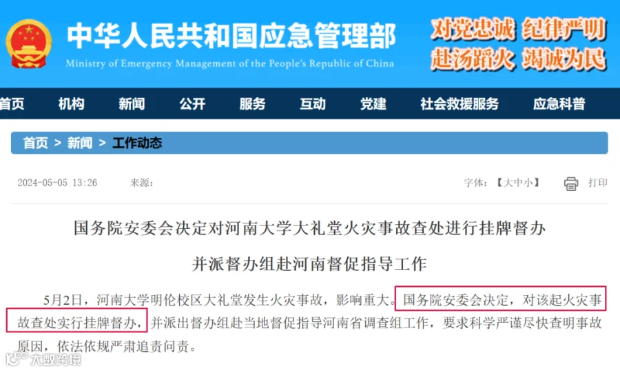 5月5日消息:国务院安委会决定,对该起火灾事故查处实行挂牌督办,并派出督办组赴当地督促指导河南省调查组工作,要求科学严谨尽快查明事故原因,依法依规严肃追责问责。